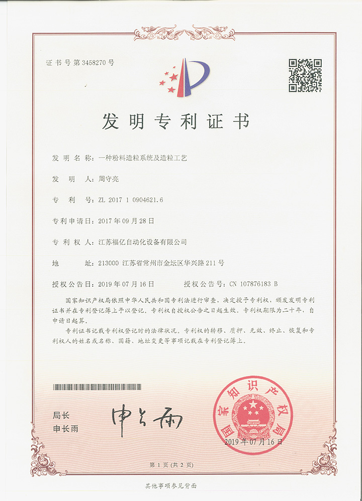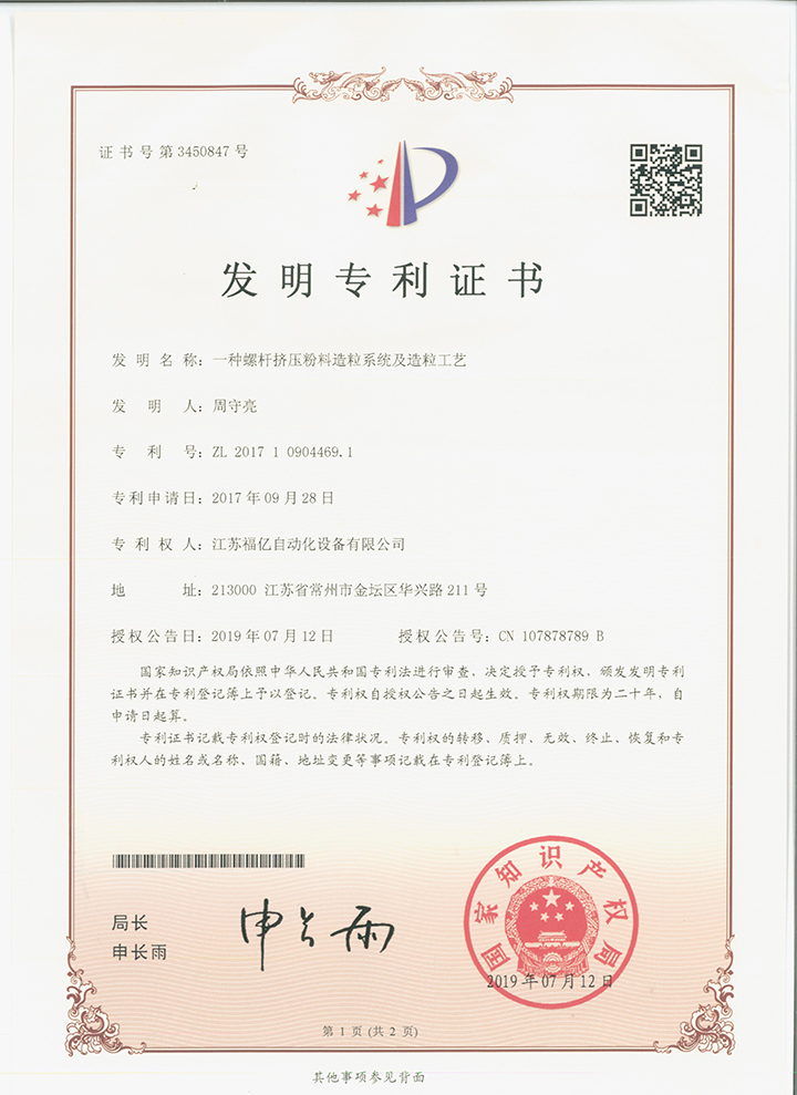 福億造粒  用科技造福億萬(wàn)客戶專利證書