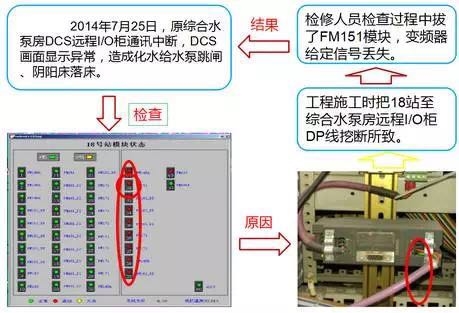2014年7月25日,原綜合水泵房DCS遠(yuǎn)程I/O柜通訊中斷,DCS畫面顯示異常,造成化水給水泵跳閘、陰陽床落床。
