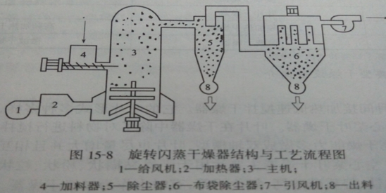 旋轉(zhuǎn)閃蒸式干燥器的直徑一般在400~1600mm之間;物料在干燥器中停留的時(shí)間可根據(jù)物料的性質(zhì)及要求通過(guò)熱風(fēng)溫度、風(fēng)量進(jìn)行調(diào)節(jié),約5~500s之間,熱風(fēng)溫度一般為110~650℃。