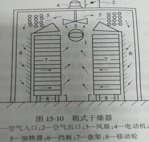 箱式干燥機(jī)主要是以熱風(fēng)通過(guò)物料的表面而達(dá)到干燥的目的。它為間歇式操作,適用于干燥時(shí)間較長(zhǎng)和數(shù)量不多的物料。通常物料裝盤用人工放入干燥器支架上,或置于小推車上送入箱內(nèi)。物料的厚度為10~100nm,熱空氣的流速為0.5~10m/s。箱式干燥機(jī)結(jié)構(gòu)如圖所示。