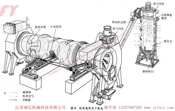 濕物料從干燥機一端投入后,在內(nèi)筒均布的抄板器翻動下,物料在干燥器內(nèi)均勻分布與分散,并與并流(逆流)的熱空氣充分接觸,加快了干燥傳熱,傳至推動力。在干燥過程中,物料在帶有傾斜度的抄板和熱氣流的作用下,可調(diào)控地運動至干燥機另一段星形卸料閥排出成品。