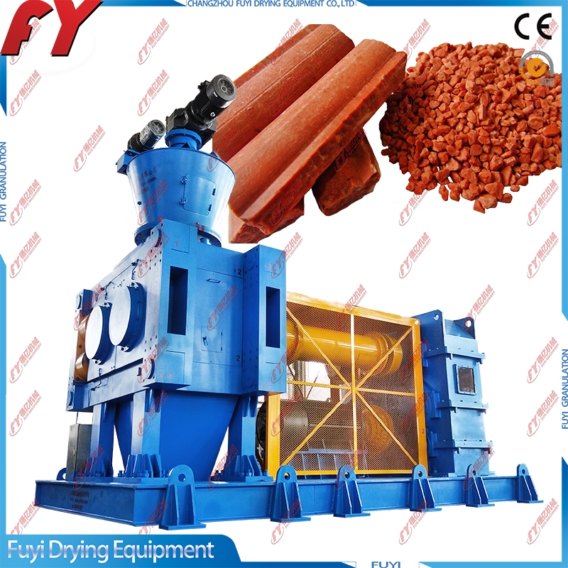 原料經定量加料器均勻送入喂料斗, 扎機利用帶有穴眼孔的成對軋輥,彼此留有一定間隙,兩者以相同的轉速作反向旋轉。其中一組軋輥軸承座在機架內不動,而另一組軋輥軸承座則在機架導軌上游動,借助液壓缸施壓使彼此緊靠。軋輥表面上有規則地排列許多形狀、大小相同的穴眼孔,且波谷對準波谷。而此時干粉狀物料從兩軋輥上方連續均勻地靠自重及強制喂料進入兩軋輥之間,物料先作自由流動,進入咬入區后被軋輥逐漸咬入波谷。隨著軋輥的連續旋轉,物料占有的空間逐漸減少而被逐步壓縮,并達到成型壓力^大值。隨后則壓力逐漸降低,所壓得之型塊因彈性回復加之自重而脫落穴眼孔而進入碎整粒、篩分裝置,所得成品為粒狀合格產品,進行過秤包裝。而粉料口出來的細粉料和不合格的超大顆粒則由返料絞龍重新進入提升機加料口隨同新鮮物料混合加入預加料斗而進入下一輪工藝流程。
