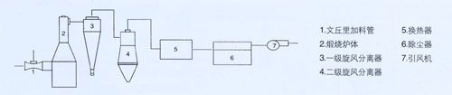 氣體經加熱爐加熱至物料煅燒溫度后,利用文丘里原理帶進煅燒物料至煅燒爐內(高溫熱氣體與物料一起切向進入爐主體內),在煅燒爐主體下部物料與熱氣得到充分混合,使物料溫度瞬間達到煅燒溫度后由氣體夾帶上升,完成煅燒。然后煅燒后的物料與尾氣一起進入收集、換熱裝置,換熱后的尾氣再經除塵器后排空,換熱得到的熱量,進行回收利用。