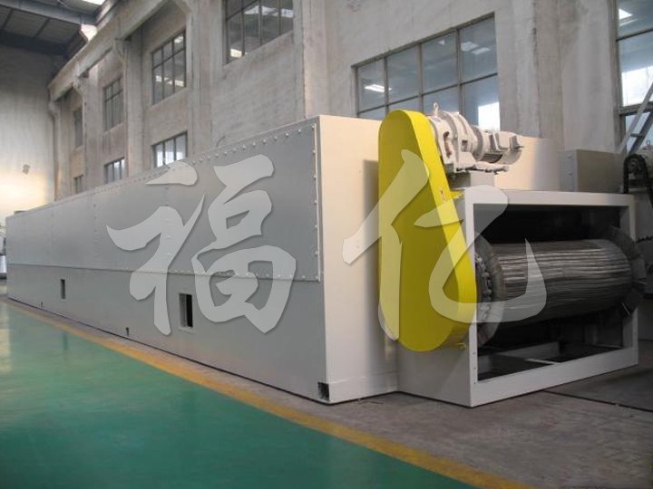 整個生產線為全封閉型(對物料而言),由擺動布料段、干燥段、出料段三部分組成。擺動布料段作用使海藻均勻分散在網板上,并且勻速輸送到干燥段,海藻經過80℃熱風干燥段,90℃熱風干燥段和120℃熱風干燥段后,再經過出料段排料。循環風向及各單元內風的循環為向下式,即加熱后的空氣由引風機吸入,在風機出風口首先預分布再經過孔板均風后,熱風從物料的下面向上(或從物料的上面向下)穿透物料層。